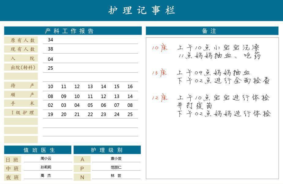護士站護理記事欄詳細顯示值班醫生、護理級別、病人人數等,后臺統一管理前臺顯示,操作簡便,界面美觀大方。