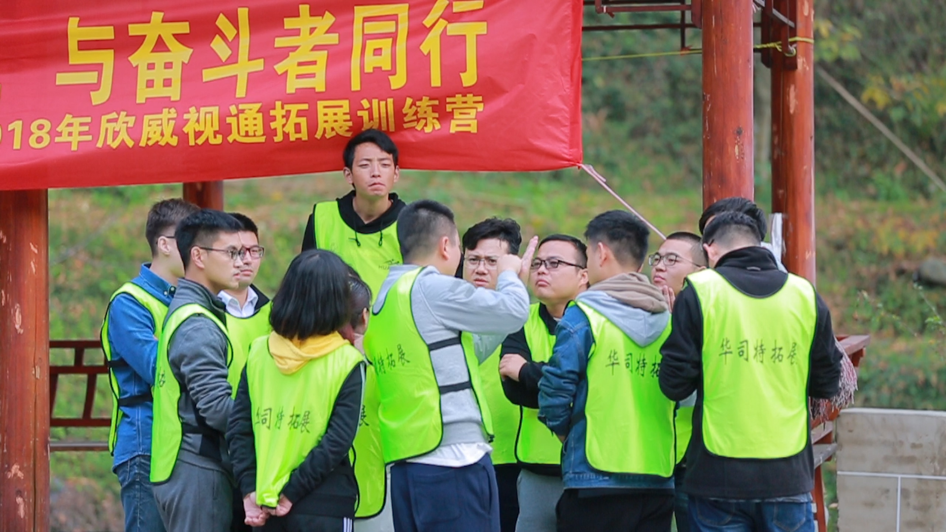經過簡短的破冰活動,大家都融入了訓練的氛圍。四個隊伍分組完成,穿上代表本隊伍顏色的衣服,跟著教練的指引,緊張的拓展訓練便正式開始了。