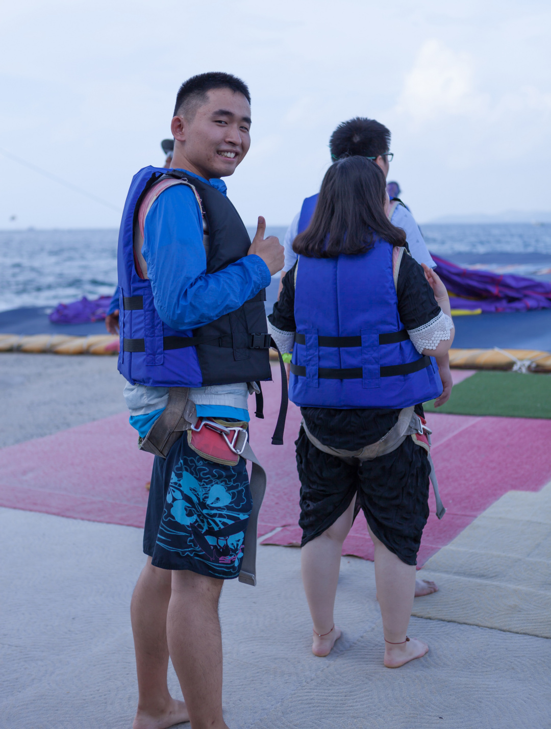 正值泰國的雨季,太陽不太大,海卻很藍。看起來甚是刺激的空中飛人,一些恐高的小伙伴躍躍欲試,在大家的鼓勵下,終于體驗了一把放飛自我。